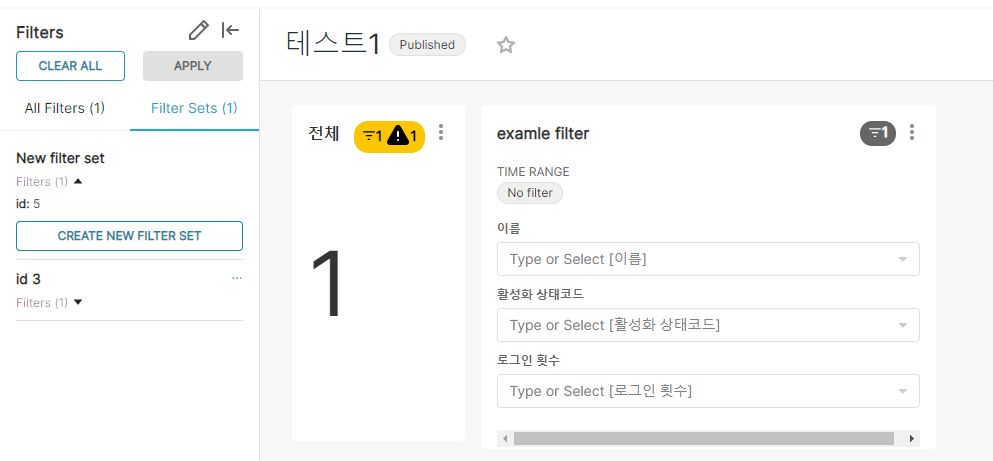현재 적용한 Filter 상태를 Filter Set으로 저장하고 싶은 경우 Filter Sets 탭으로 이동 후 Create new filter set 버튼을 클릭하면 된다.