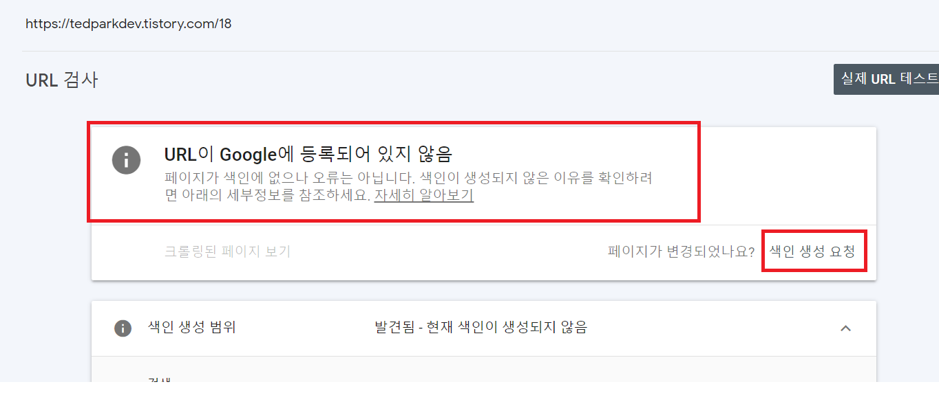 상단의 url 검사 필드에 검색이 되지않는 글의 url을 입력해준다.