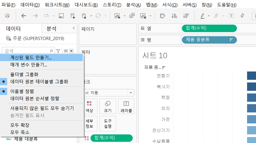 1. 데이터 보기 옆 아래 화살표 클릭 > 계산된 필드 만들기