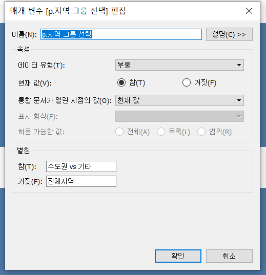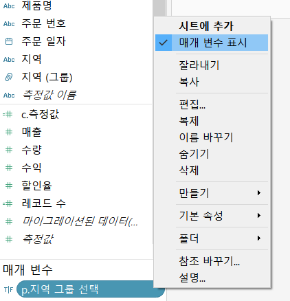 6. 데이터 보기 아래 화살표 클릭 > 매개 변수 만들기