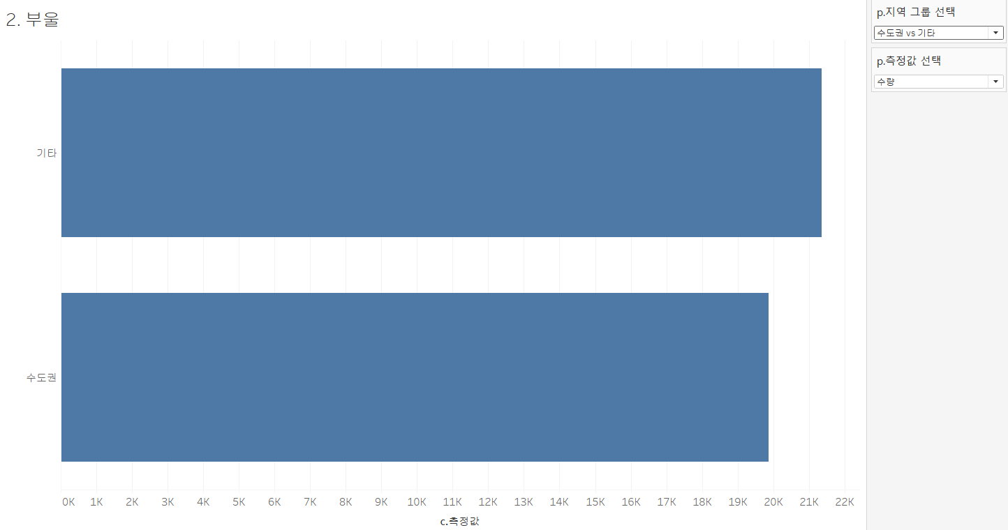 - 지역별(수도권, 강원, 영남...)로 구분되어 있는 통계값을 수도권 vs 기타 지역으로 구분하여 표시